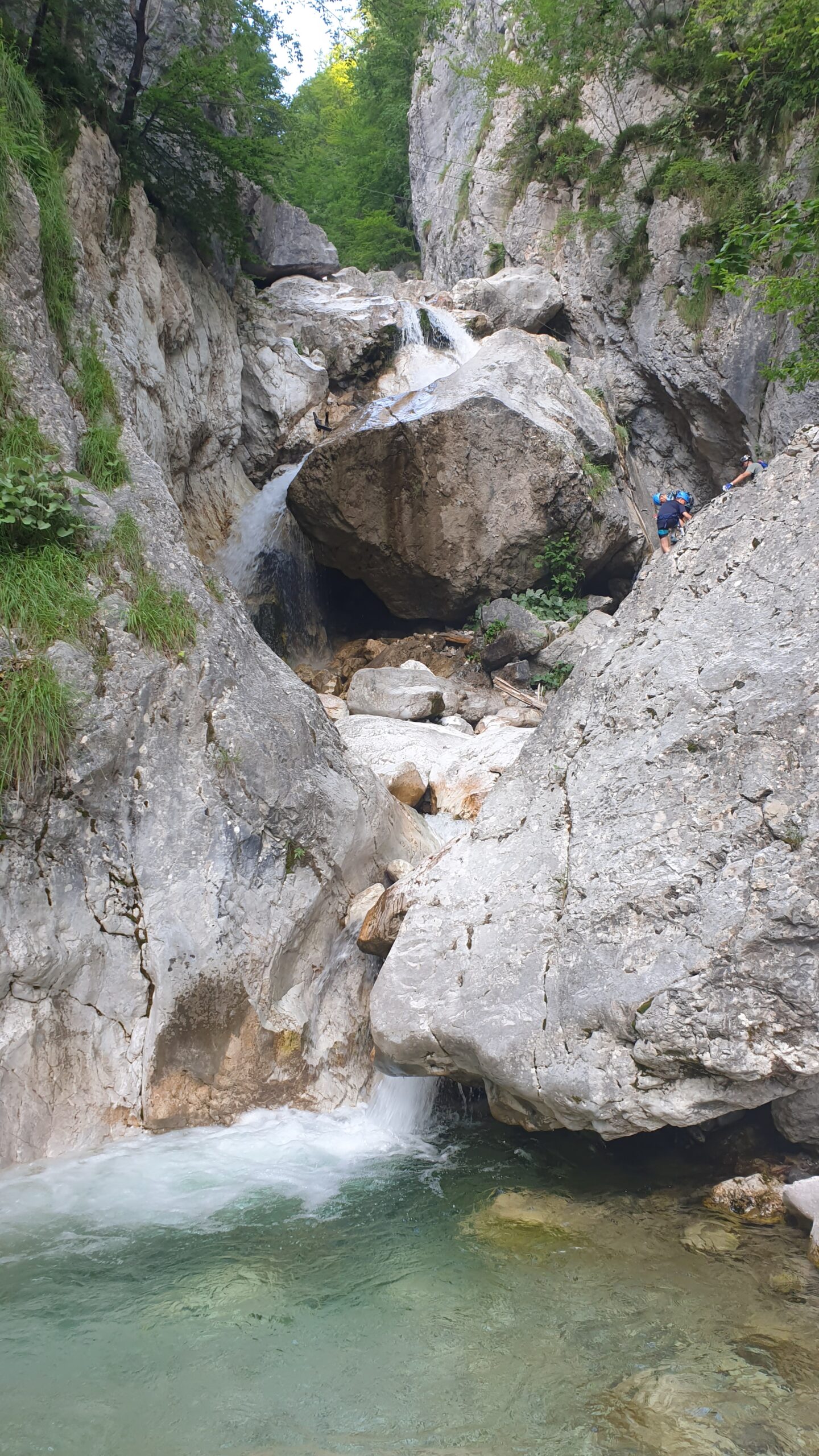Popoldan je padla odločitev, da napadeva še ferato Jerman. Na izmene, da je eden lahko delal družbo Belki. Prva sem se odpravila kar sama, medtem ko je Ruševec vozičkal po Martuljku. Ferata je bila prijetna ozsvežitev v vročinskem valu. Vsekakor sem si z njo potešila delček hrepenenja po skalah, če tudi sem ga gor in dol tako šibala, da sem komaj videla slapove okoli sebe. Tako pač je, če se po mesecih hibernacije znajdeš z viškom energije.