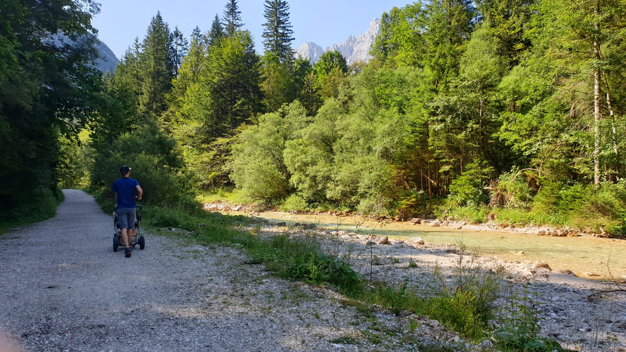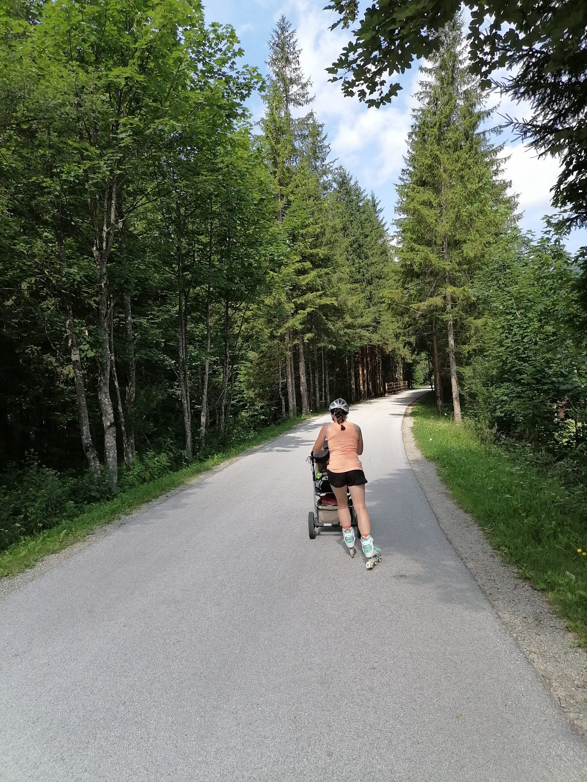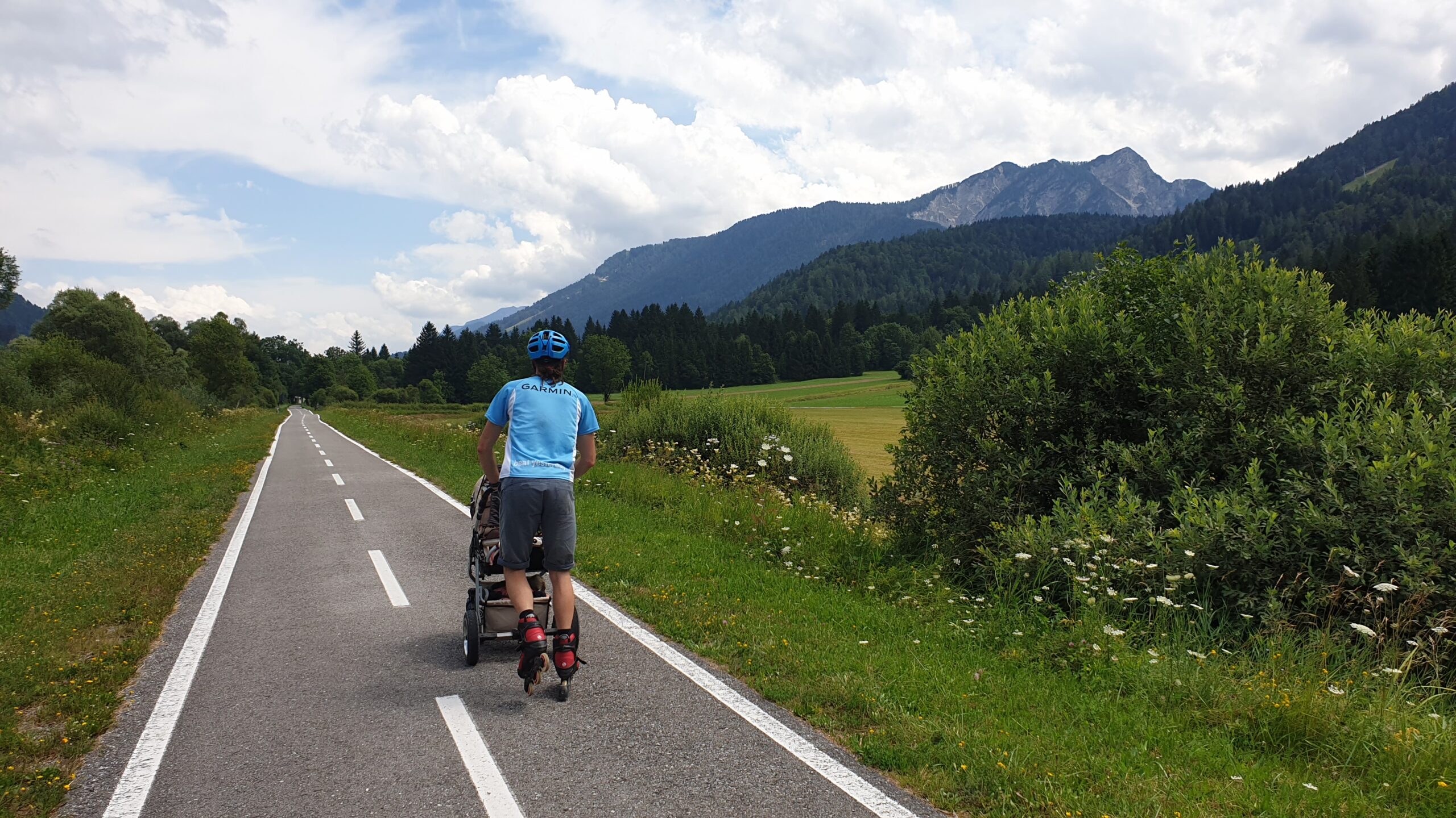 Fantastična tura po delno senčni cesti. Veter nas je prijetno hladil, medtem ko sem v ozadju občudovala menjujočo kuliso mogočnih gora. Zadnji kilometer gre navkreber po slabši cesti, rolarje tam odsvetujem. Nazaj grede sva midva ta del kar prepešačila z rolarji na hrbtu. Zadnjih nekaj sto metrov sva nesla tudi voziček, saj je bila pot preveč zaraščena s koreninami.