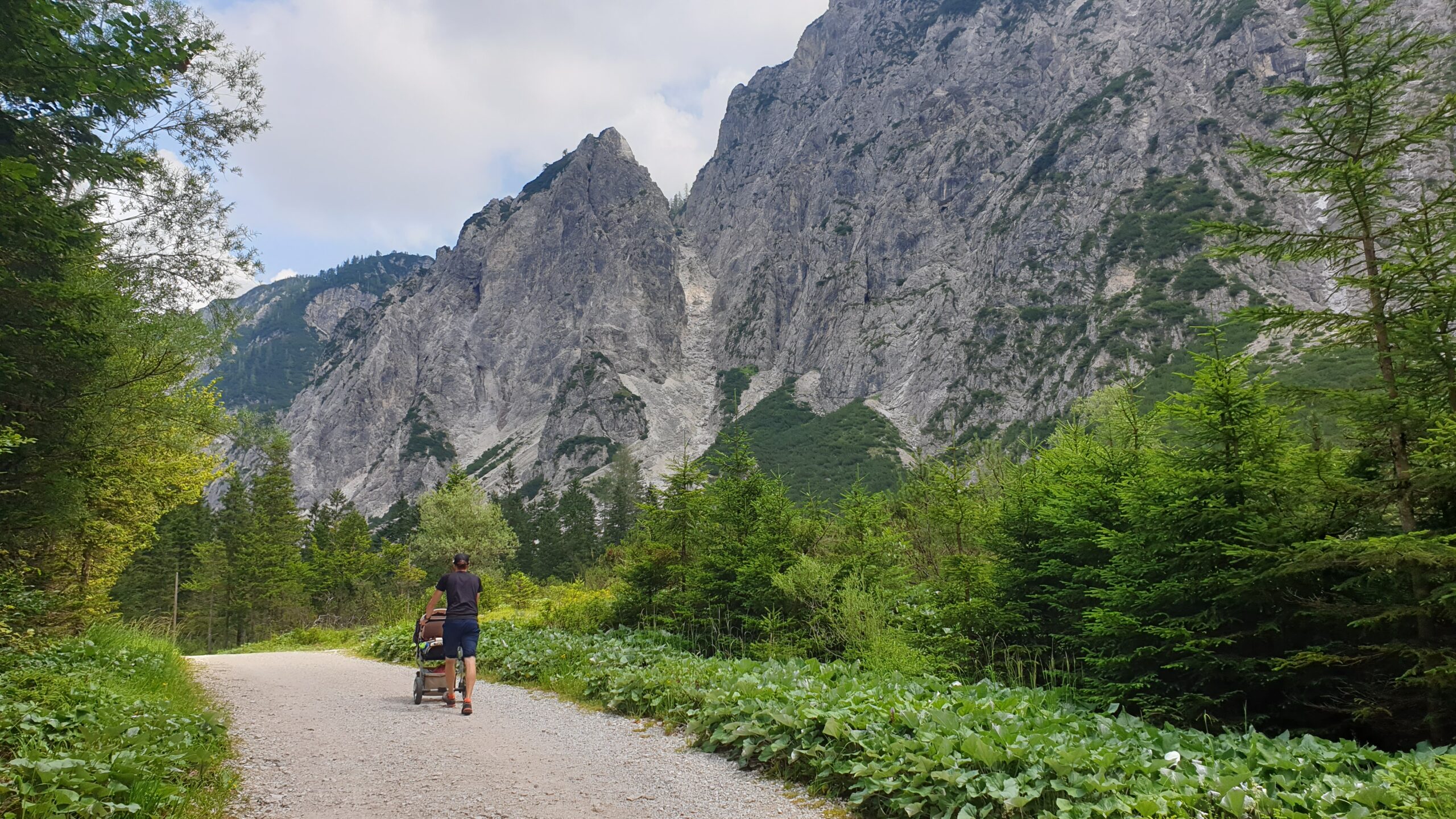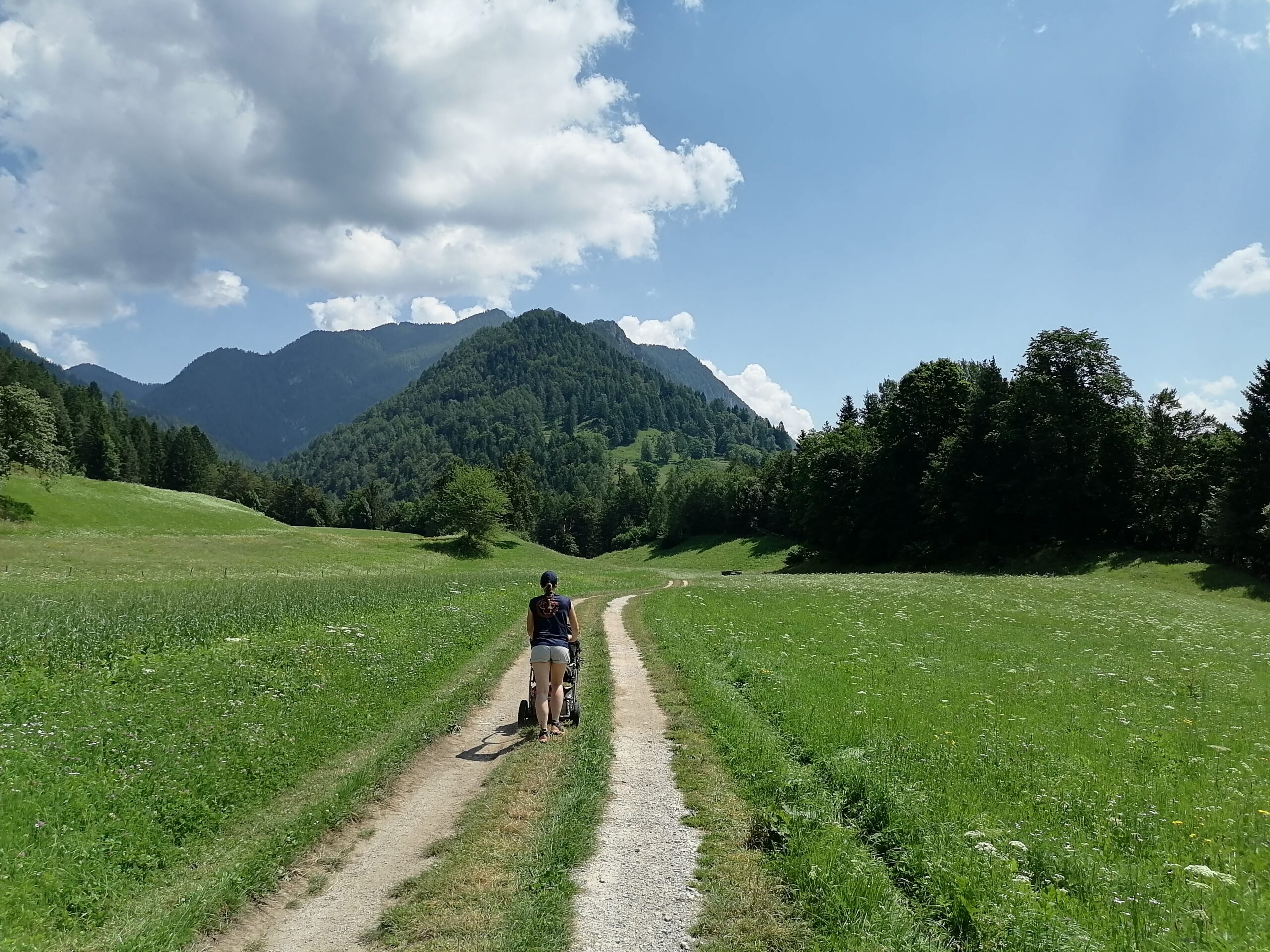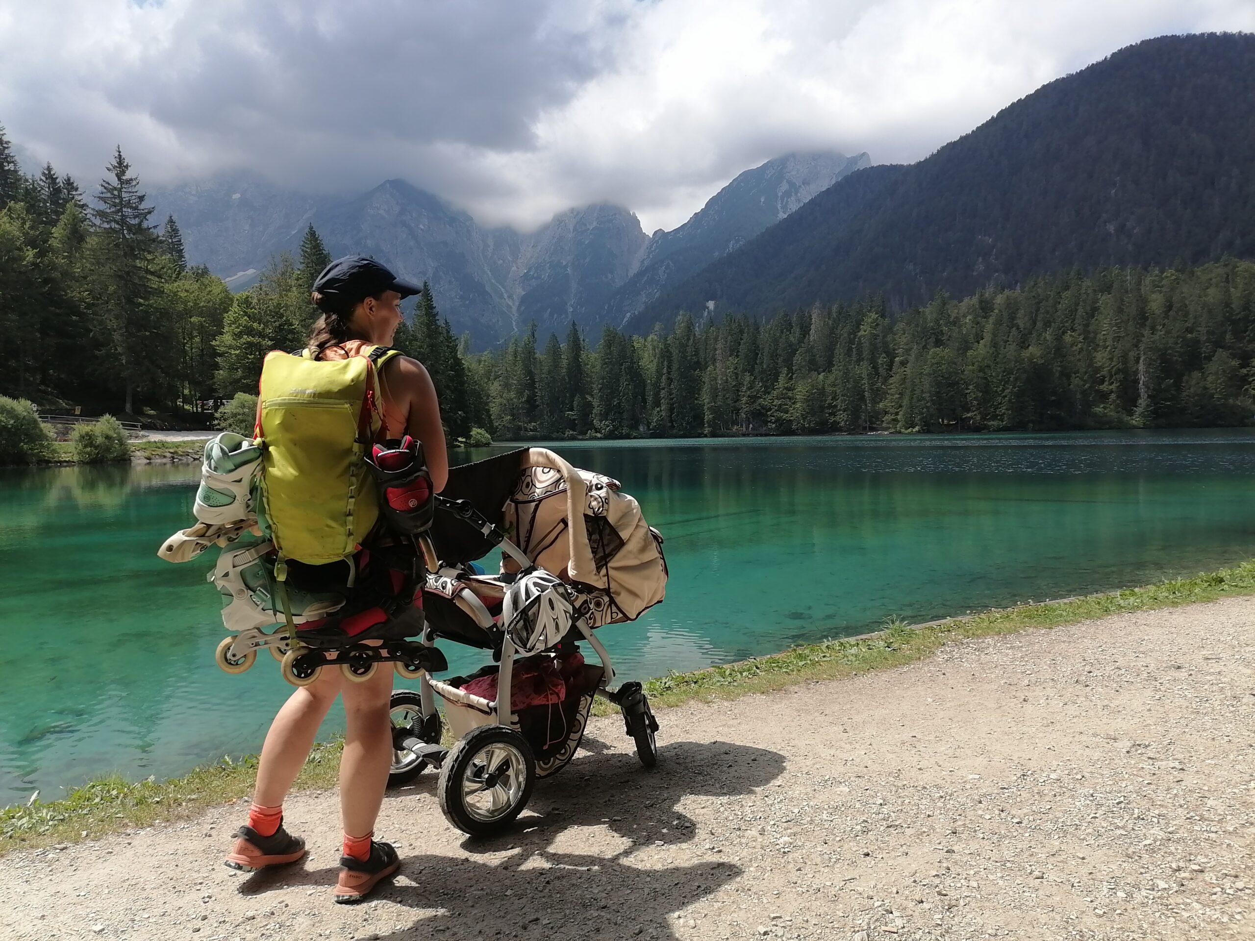 Fantastična tura po delno senčni cesti. Veter nas je prijetno hladil, medtem ko sem v ozadju občudovala menjujočo kuliso mogočnih gora. Zadnji kilometer gre navkreber po slabši cesti, rolarje tam odsvetujem. Nazaj grede sva midva ta del kar prepešačila z rolarji na hrbtu. Zadnjih nekaj sto metrov sva nesla tudi voziček, saj je bila pot preveč zaraščena s koreninami.