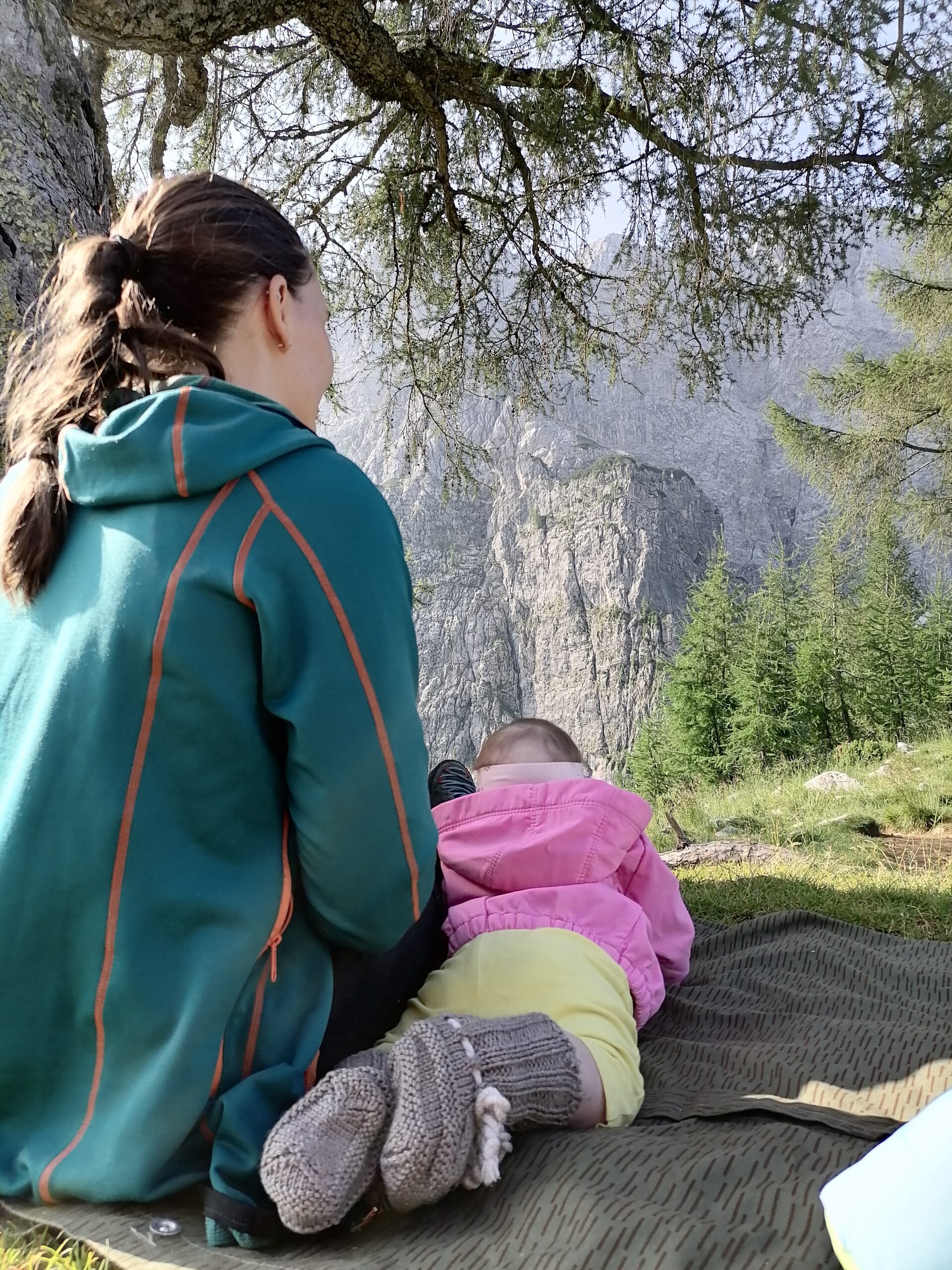 Malo pod vrhom smo raztegnili šotorko, nato preoblekli mokra oblačila, se previli in se zavili v vetrovke ter nazadnje pod senco drevesa pomalicali in uživali ob pogledu na severno steno Mojstrovke. Medtem ko je Belka radovedno gledala okoli, sva midva iskala plezalne smeri v ostenju Mojstrovk in Travnika ter se čudila malemu potrpežljivemu bitju, ki je radovedno zrlo v svet. Zaigralo mi je srce ob misli, kako lepo se da združiti materinstvo in ljubezen do gora.