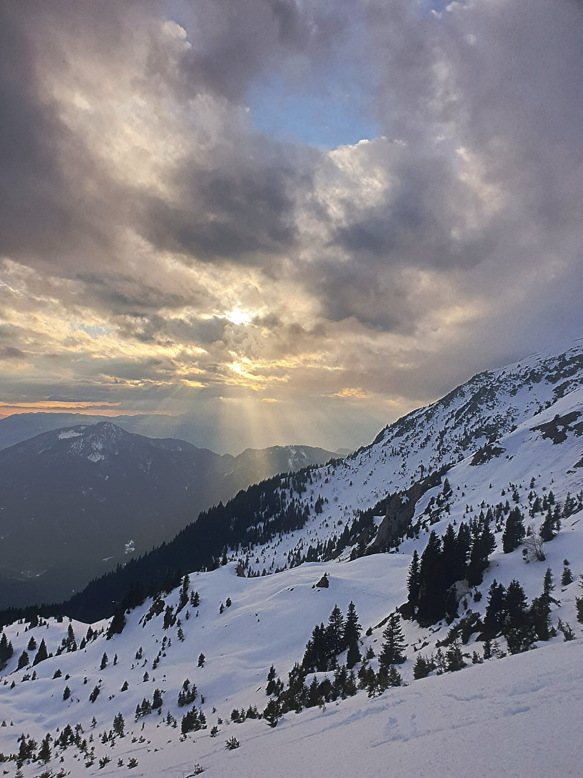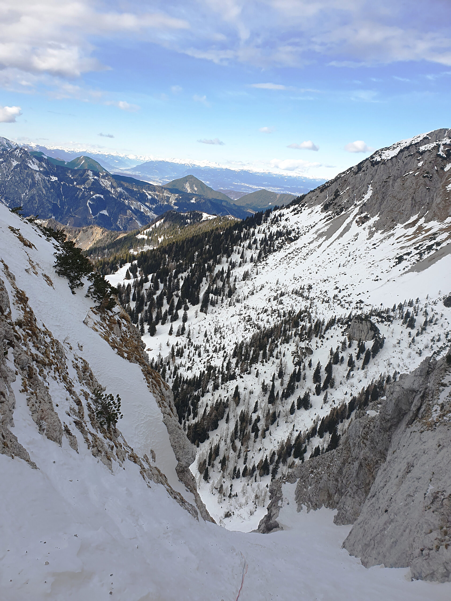 Sestop je bil vse kaj drugega kot miren. Odpravili smo se po severni strani, kjer poteka ferata. Sneg se je kot stiropor ugrezal in sploh ni hotel držati. Vsak korak in udarec s cepinom so bili kot hoja po zraku. Spodaj pa prepadni skok. Telo še ni bilo utrujeno, glava pa ni več zmogla. Z mojo boljšo polovico sva se odločila, da bova sestopila po južni strani proti Kofcam, če tudi to pomeni, da bova pet kilometrov hodila po cesti, da prideva nazaj do avta.