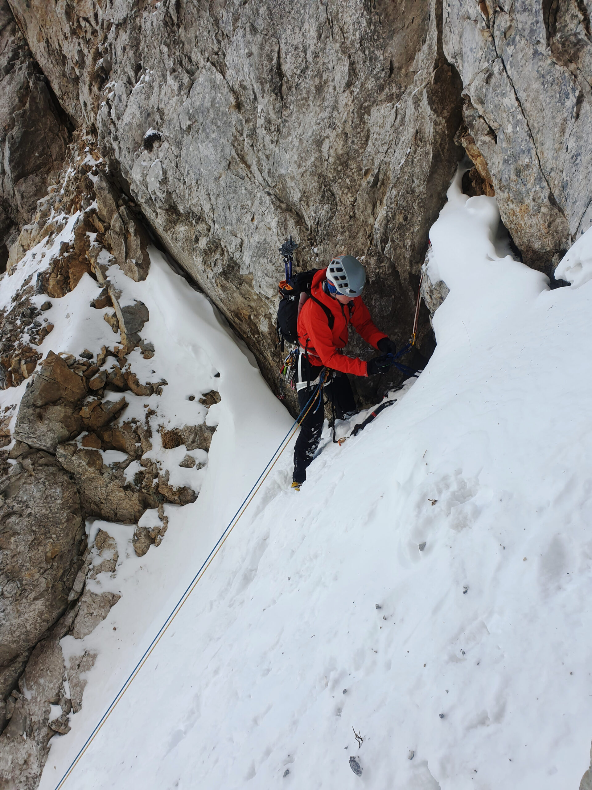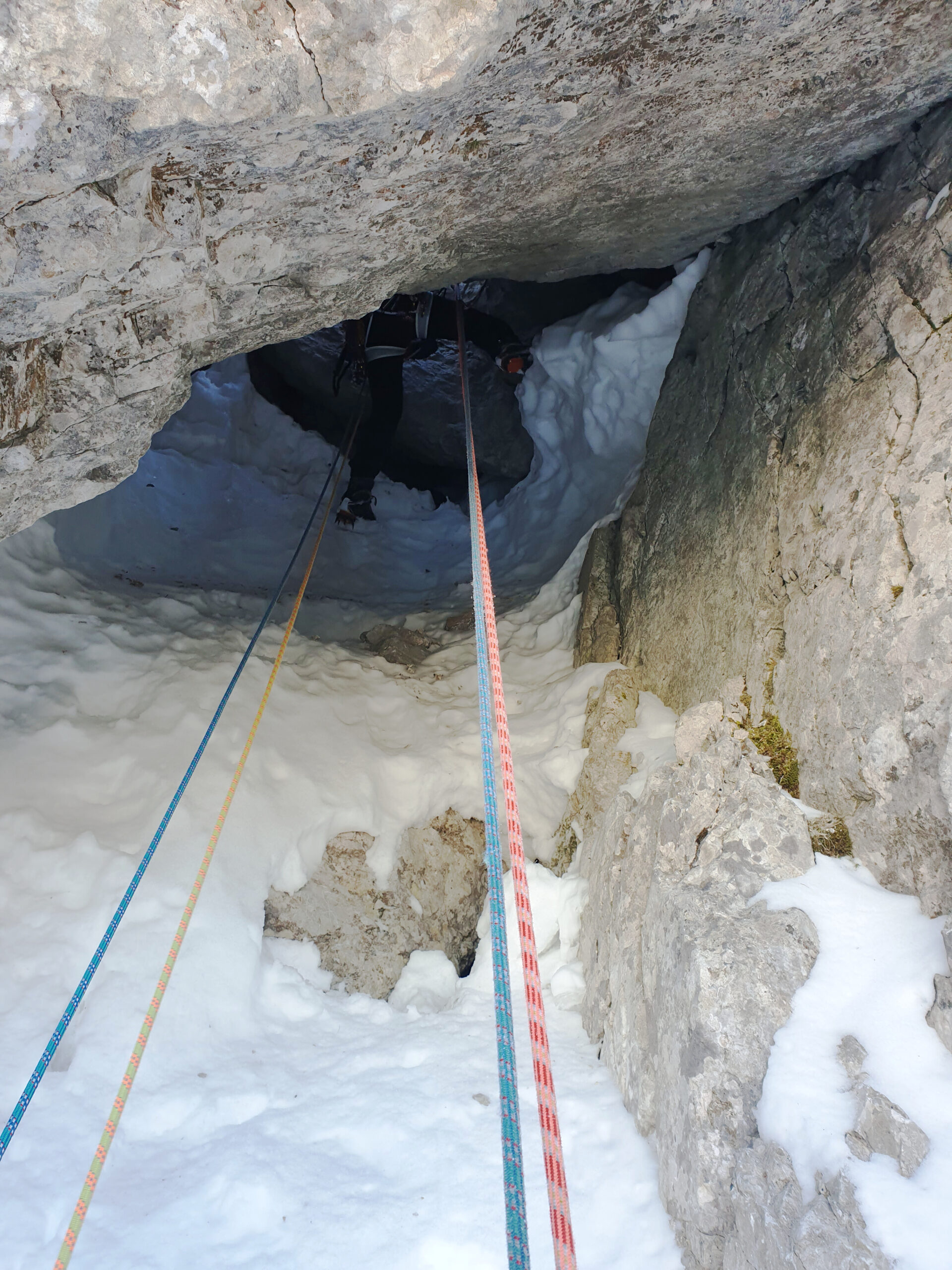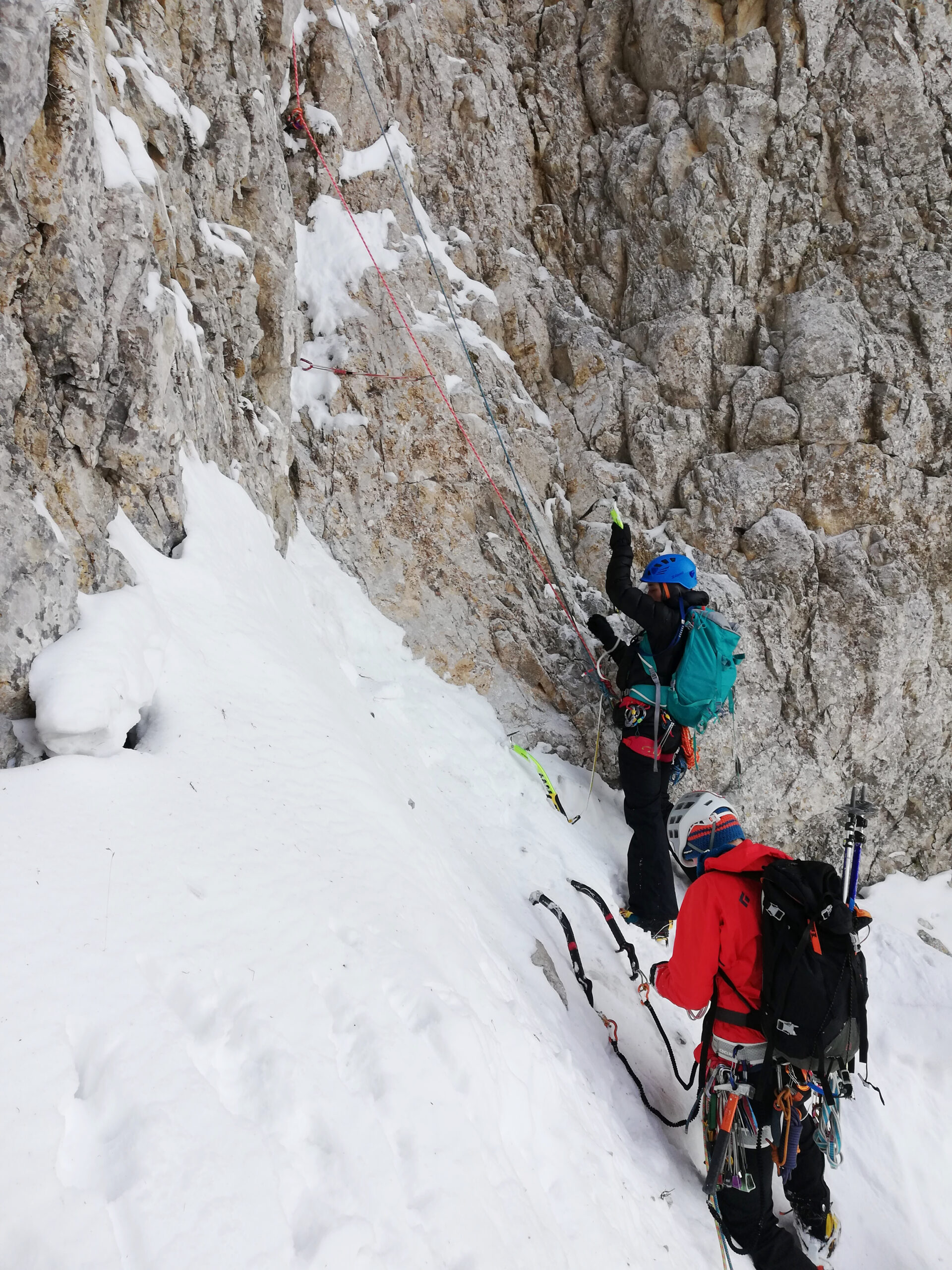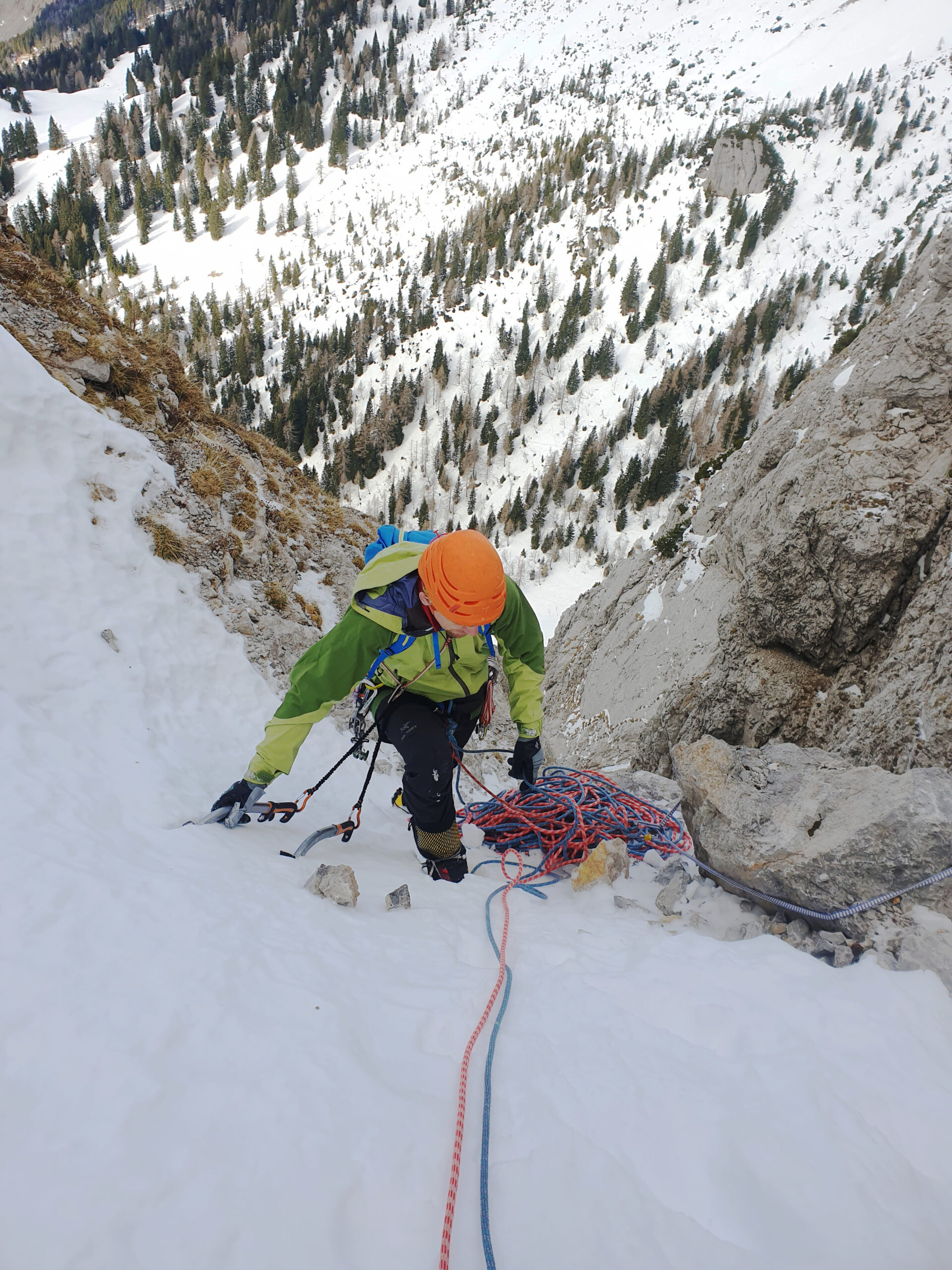 Na naslednjem sidrišču mi je na čelado padla ogromna skala, ki jo je v globino sprožil štrik nad mano. Na zadnjem štantu pa sva sidrišče morala postaviti v mehkem snegu in soplezalca varovati na telo.