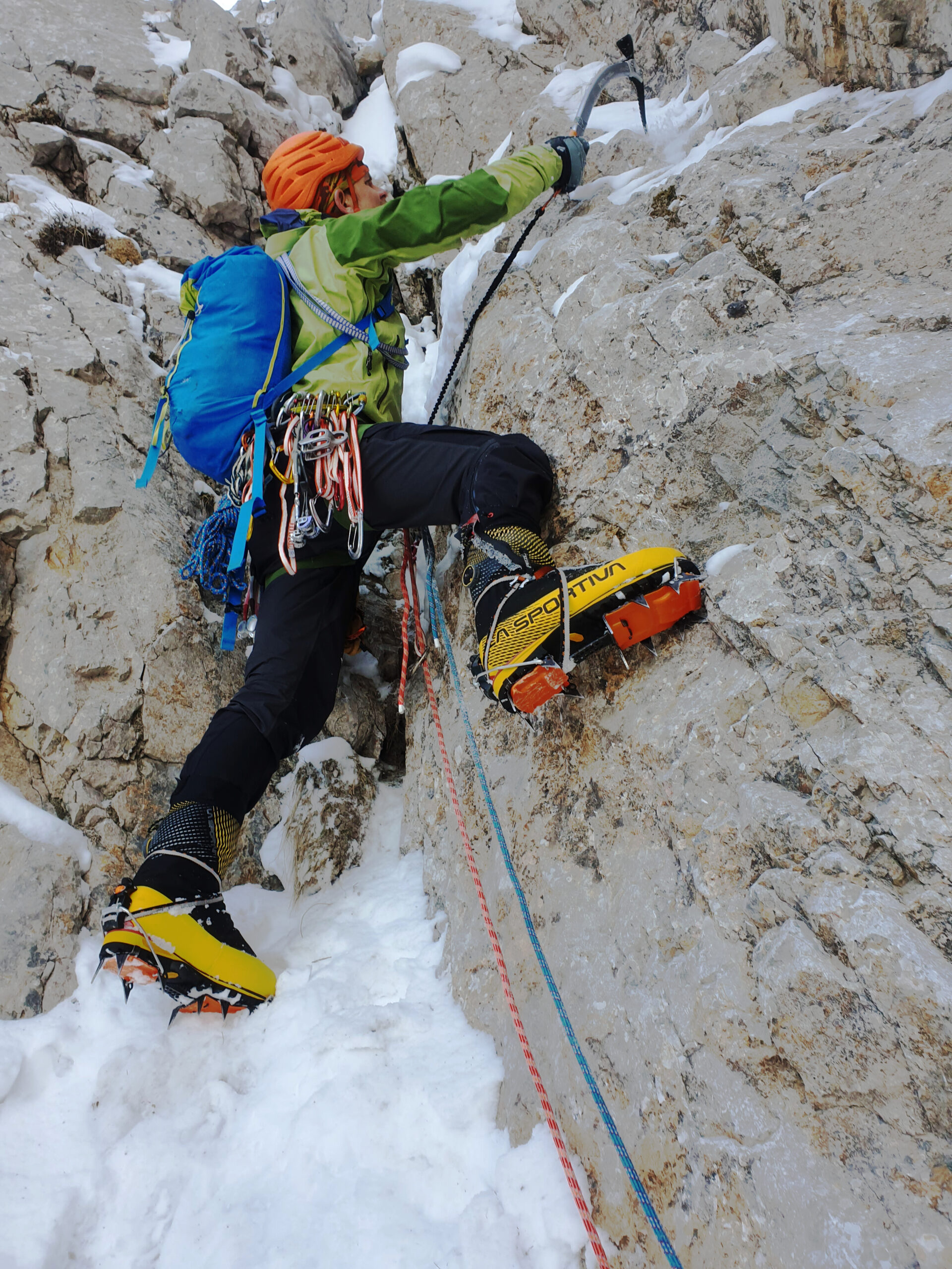 Že na samem začetku se je pričelo toolanje po skali, saj skoki niso bili zaliti. Stanje na dveh oklih cepinov in na prednjih zobcih derez je kar hitro začelo navijati mišice. Dvignila sem cepin in ga poskusila zatakniti, nikjer nisem našla primerne skale ali poke, ki bi cepin obdržala. Ko sem cepin le zabila v zmrznjeno zemljo nekje nad glavo, mi je izmaknilo kovinske zobce derez in padla sem. Obvisela sem deloma na štriku in deloma na dveh cepinih. Ko sem ugotovila, da se je padec še predčasno ustavil, sem vdihnila od olajšanja. V drugem poskusu sem se le zvlekla čez skok. Sledilo je kratko soliranje po snežišču.