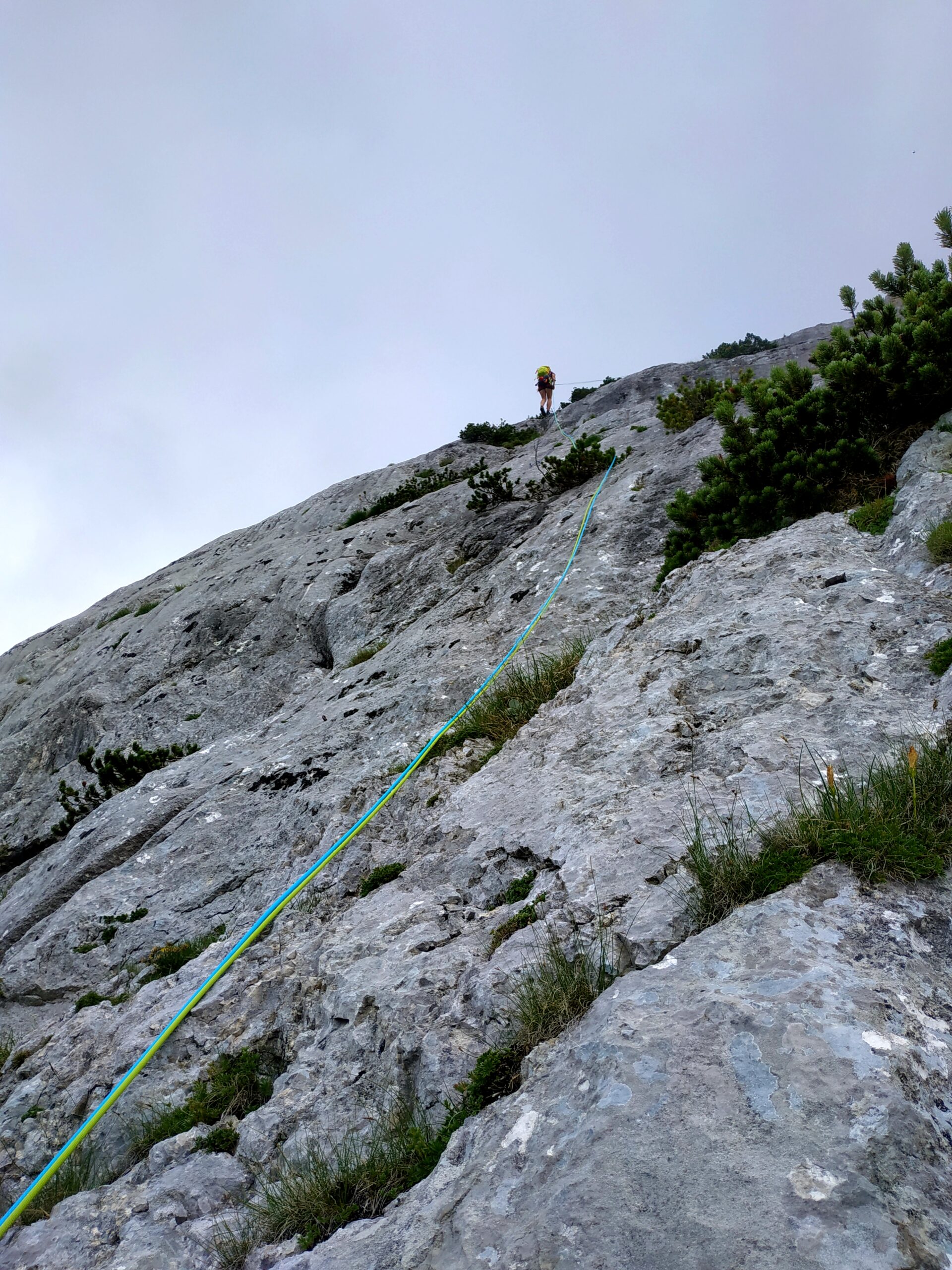 Na sebe sva navesila vse železje in se zabasala v smer, ki je postregla s čudovitimi platkami in težavnostjo prijetne petice. Stena je bila obrnjena na jug in prav gotova sem bila, da bova ven prišla kot pečena martinčka. Prvi raztežaj sem plezala naprej, najprej sem se morala zbasati čez previs, ki je po mojem mnenju tudi predstavljal detajl smeri. Nadaljevala sem čez platke, kjer je občasno zmanjkalo oprijemov, zato je bilo potrebno splezati na trenje. Štantala sem kar na skalnem ušesu. Drugi raztežaj sem plezala kot druga, cug je zopet postregel s prijetno plezarijo in svedrovci, ki so na hribovski razdalji pomagali pri orientaciji. Tretji raztežaj sem zopet potegnila naprej, postregel je z malo bolj krušljivim svetom. Četrti raztežaj pa je bil čista fantazija. Pri tretjem raztežaju so nebo prekrili oblaki in namesto pečice na skali sva dobila prijetno hlajenje. Na vrh sta namesto “dveh well done stejkov” tako prišla rahlo izmučena plezalca.