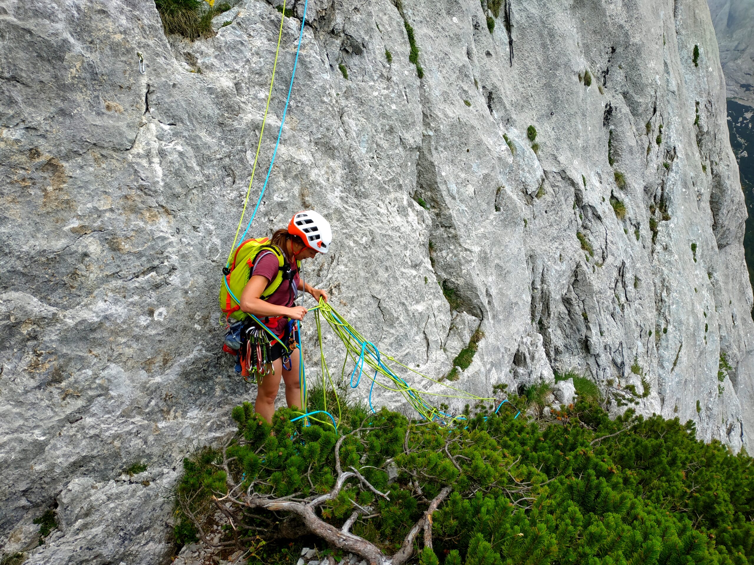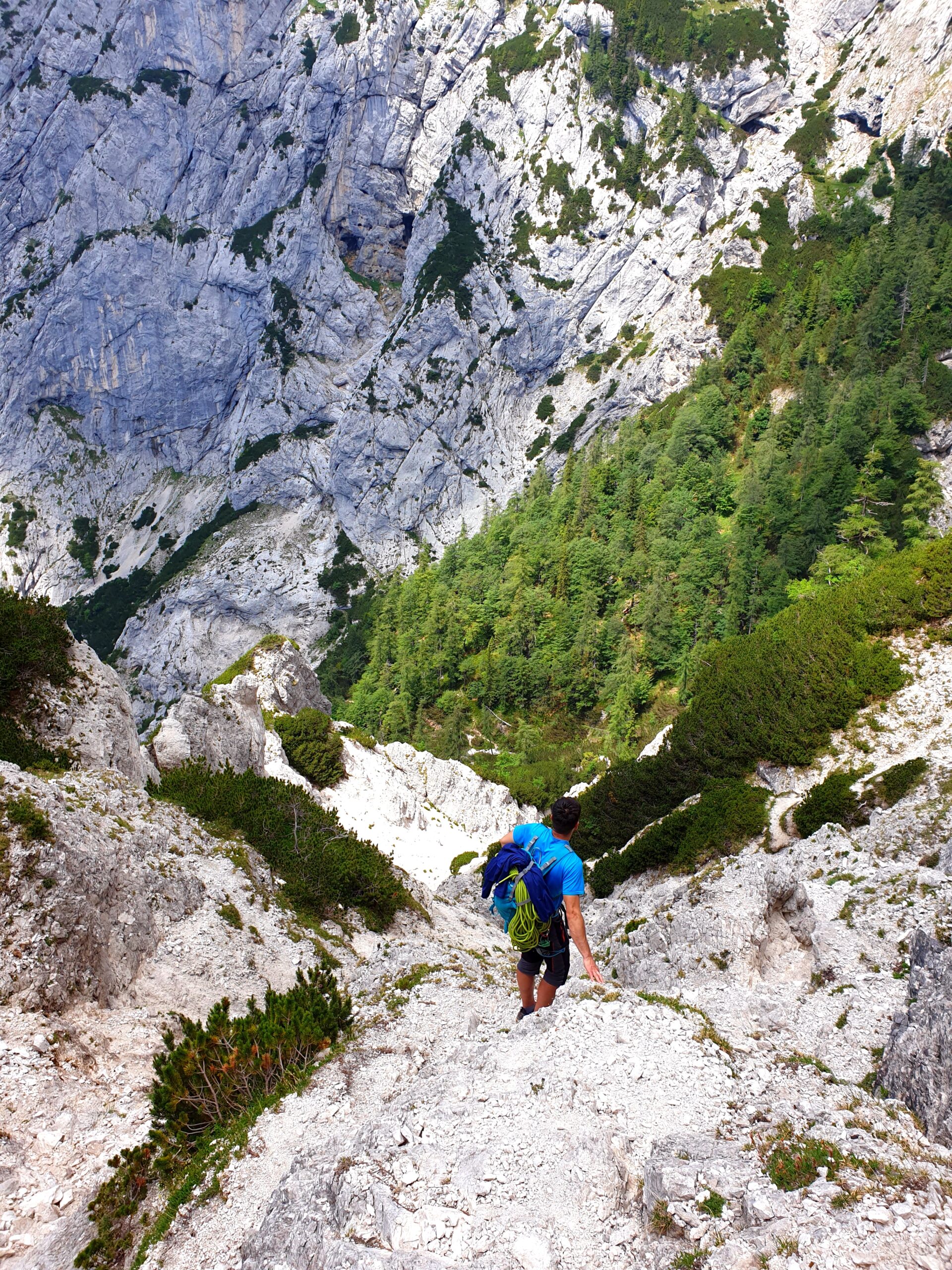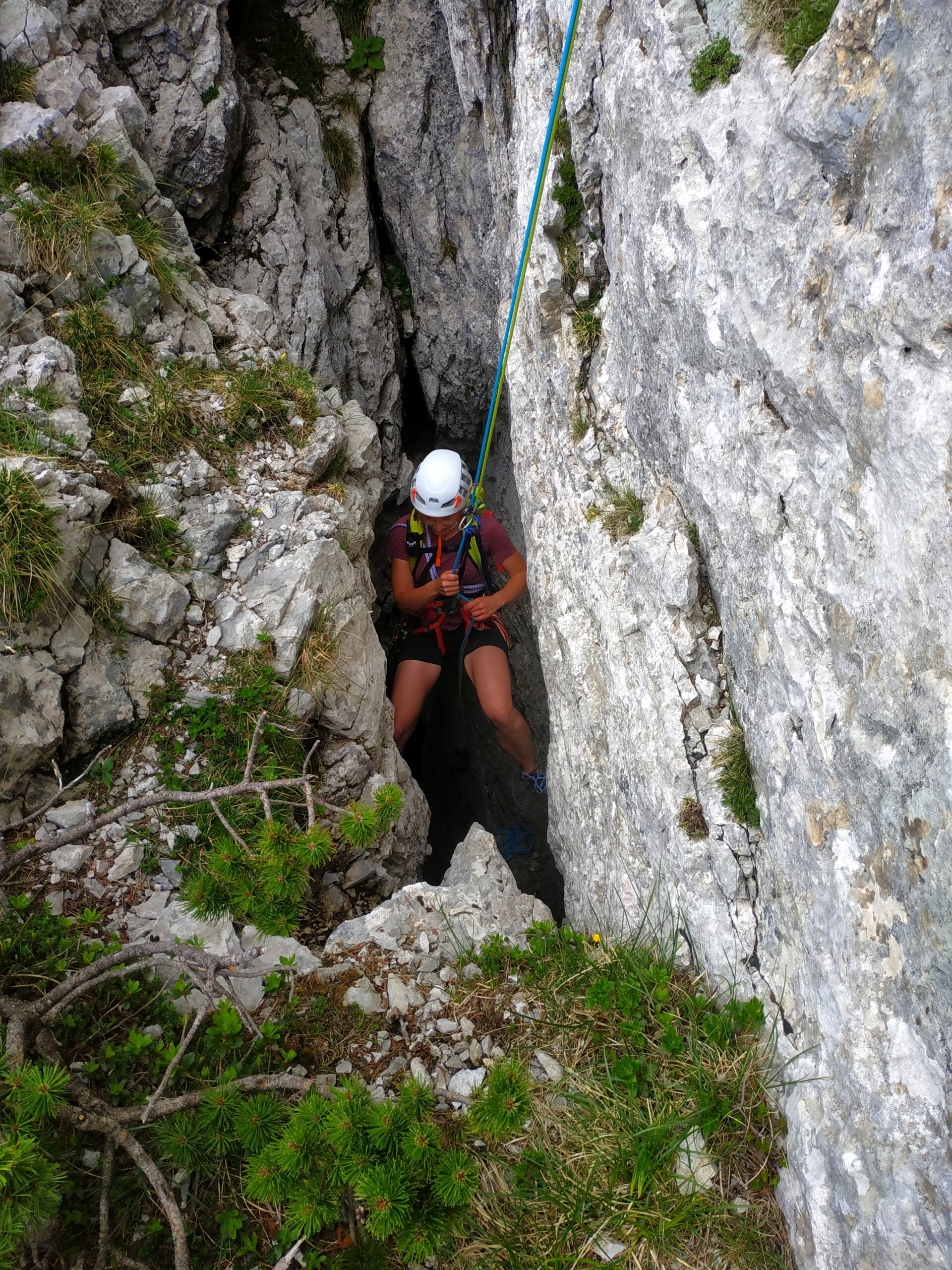 Da sva svojo turo še začinila, sta naju ob sestopu čakala dva šestdeset meterska abzajla. Drugi abzajl poteka naravnost v jamo, kovačnico, ki sprva izgleda kot brezno brez dna. Če bolje pogledaš, pa lahko vidiš svetlobo z druge strani jame. Spust v jamo je plezariji dodal le še dodatno aromo, ki je celotno dogodivščino spremenila v harmonijo gorskega pohajkovanja.