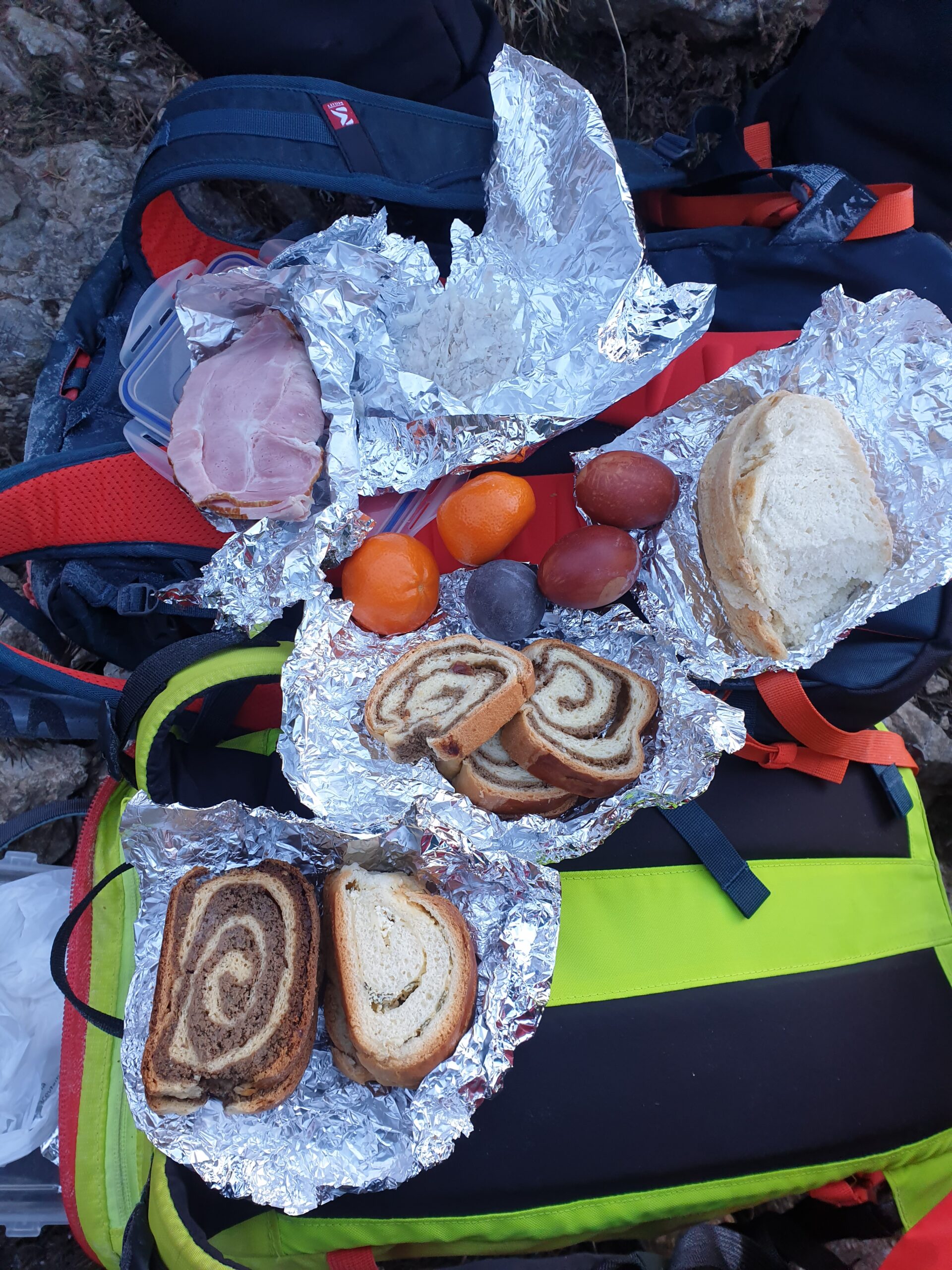 Nadaljevali smo pot nazaj proti izhodišču in na prvem brezvetrnem mestu sedli ter razprli malico – pravcati velikonočni zajtrk. Z največjim užitkom smo pojedli prvi obrok dneva, medtem pa opazovali zelenečo dolino, na katero so se razsipavali zlati prameni sončne svetlobe.